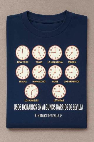 Camiseta de manga corta, talla L, color azul oscuro, con diseño humorístico “Usos horarios en algunos barrios de Sevilla” – Matador de Sevilla.
